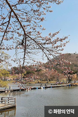 신라 화랑 김유신이 수련하며 검으로 바위를 갈랐다는 이야기가 전하는 단석산 등산로 입구에 있어 화랑의 언덕이라고 이름 붙였습니다. 방송에서처럼 널찍한 잔디밭과 걷기 좋은 산책로, 서정적인 풍경의 저수지가 한데 어우러져 느긋하게 쉬어가기 좋고 여름에는 노란 해바라기, 가을에는 은빛 억새가 일렁이며 계절의 정취를 만끽할 수 있는 곳입니다. 웅장한 산자락이 한눈에 들어오는 명상바위와 저수지 내에 마련된 테이블 등은 인기 포토존으로 꼽히고 있습니다.