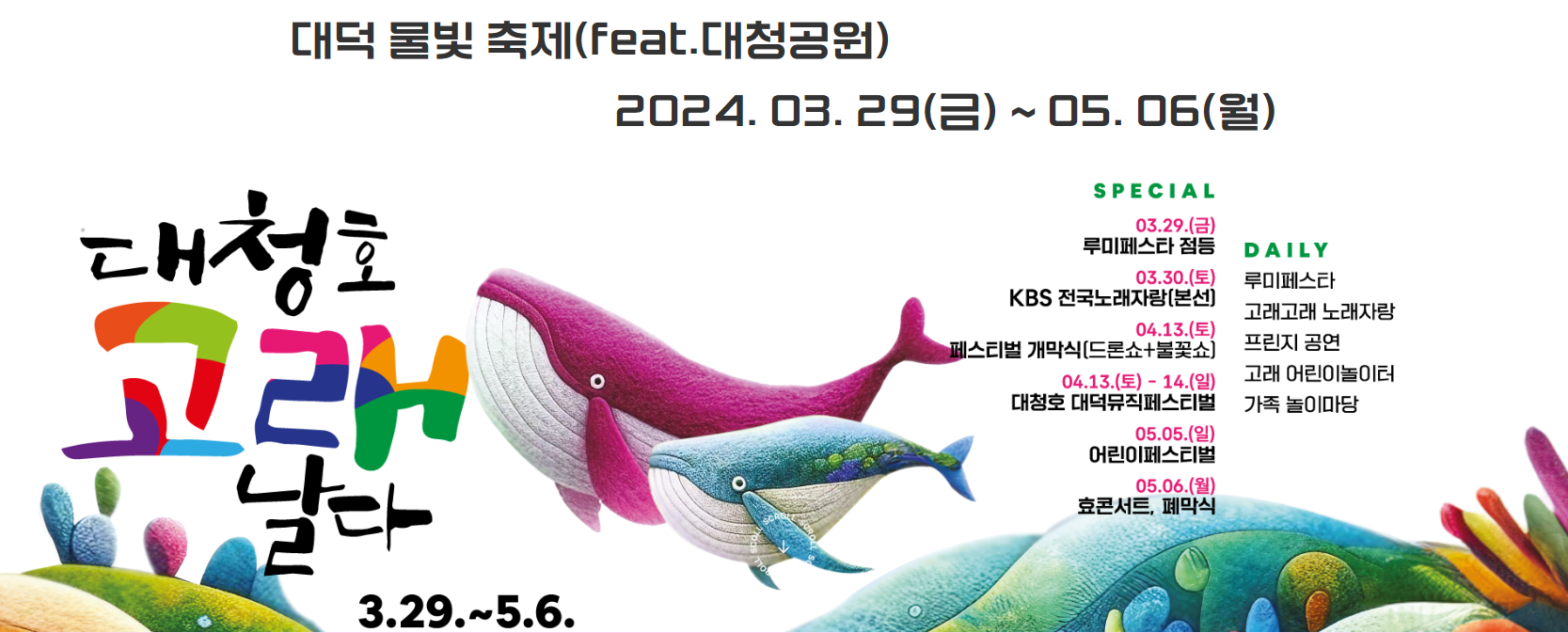 대전의 대표관광지 대청호에 빛경관을 조성하고 공연,전시,체험을 연계하여 새롭게 출범하는 대덕구 대표 축제입니다.